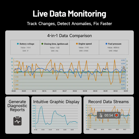 Motor, ABS, süspansiyon, eğlence sistemi ve daha fazlası dahil tüm sistemlerde kapsamlı teşhis sağlar. Arıza kodlarını okuyup temizleyebilir, canlı verilerle sorunları büyümeden önce proaktif şekilde izleyebilirsiniz.