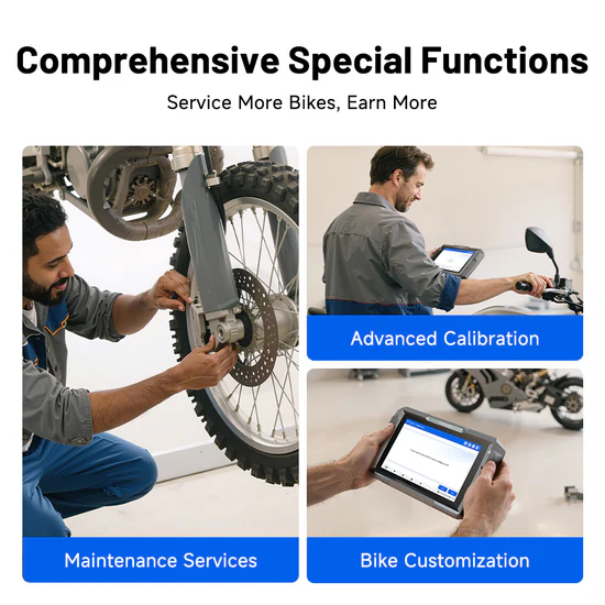 UltraDiag Moto; yağ sıfırlama, gaz kelebeği ayarı, ABS havasını alma gibi bakım işlemlerini destekleyerek düzenli servis ihtiyaçlarını tek yerden yönetmenizi sağlar. Ayrıca bazı modellerde fonksiyonları açma/kapama ve fabrika ayarları üzerinde kişiselleştirme gibi gelişmiş senaryoları da destekleyebilir. Daha ileri seviyede ise cruise control, rölanti hızı ve açı sensörleri gibi alanlarda kalibrasyon odaklı işlemler sunabilir. (Özel fonksiyonlar marka/model/yıla göre değişebilir.)